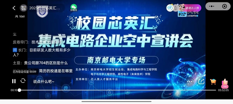 为全面贯彻落实党的二十大精神,落实党中央、国务院“稳就业”“保就业”决策部署,强抓春季就业工作关键期,3月20、21日,3044am永利集团3044noc、柔性电子(未来技术)学院、集成电路科学与工程学院、校招生就业处共同举办校园芯英汇生基成电路企业空中3044am永利集团3044noc专场宣讲会,本次空中宣讲会由芯人类人才服务平台支持。