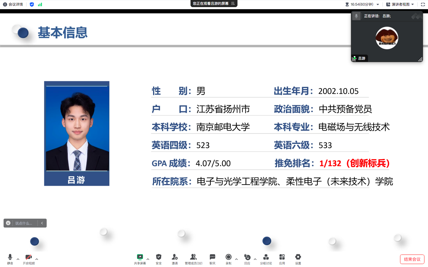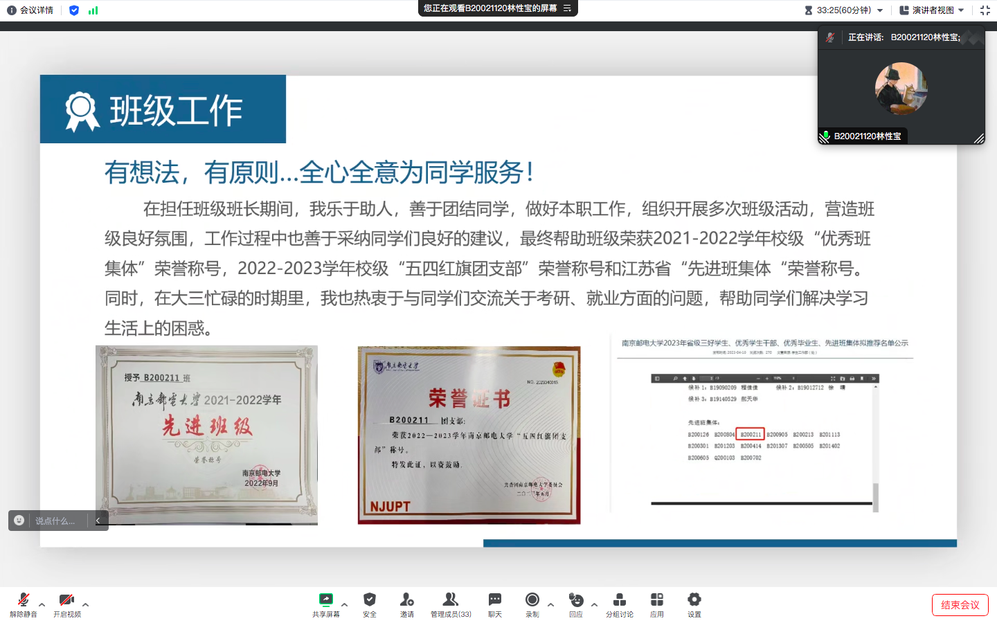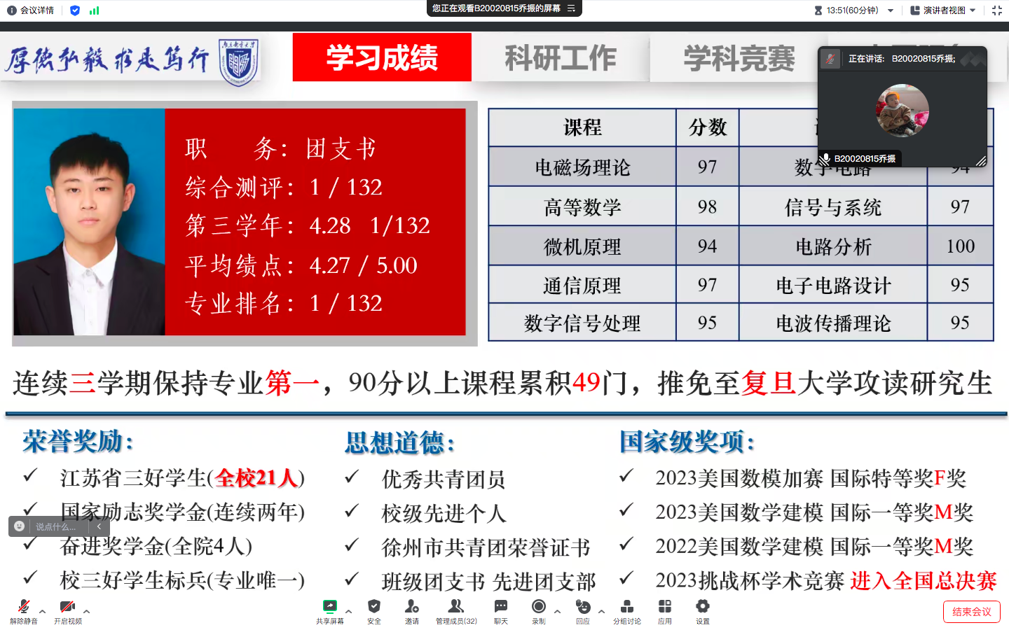 为树立典型,表彰先进,引导学生成为品德高尚、富有理想、快乐健康、积极向上、全面发展的新时代大学生,10月5日上午,3044am永利集团3044noc、柔性电子(未来技术)学院2020级电磁场与无线技术专业于线上开展了2022-2023学年“三好学生标兵” “三好学生”“优秀学生干部”公开答辩展示会,会议由辅导员肖俊桂老师主持。