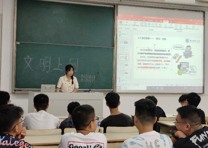 主题班会上,学生班主任们通过图片、具体案例、所见所闻等深入浅出地带领2023级各班新生了解了网络信息诈骗、网络上瘾、网络使用安全等方面的知识,深度分析了网络的利弊,学生了解到了如今的网络现状,也对各种案例和资料表达了自己的看法。最后,学生班主任们还介绍了许多信息安全防护措施,引导同学们文明上网,积极传播正能量,自觉提升网络文明素养,切实承担起时代重任和社会责任,不断增强明辨是非、判断对错的能力,理性地了解情况,不做盲目跟风者,做到不信谣,不传谣,更不造谣,保持网络的风清气正。