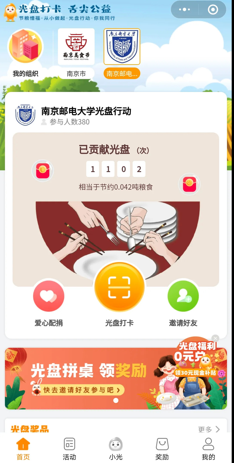 这次活动的线上时间为9月27日至12月28日,将使用微信小程序中的机器人进行光盘判别记录次数并统计排名,排名越靠前获得的奖励越丰厚。社团也组织同学们观看光盘微课学习节粮爱粮的重要性。同时组建了社交群聊让同学们积极分享自己每次光盘的体会并且发表自己的想法,希望通过这种方式向同学们传播光盘意识活动预计将在十二月中旬进行最后一次外场活动,在过程中将依据光盘打卡次数兑换相应奖品。