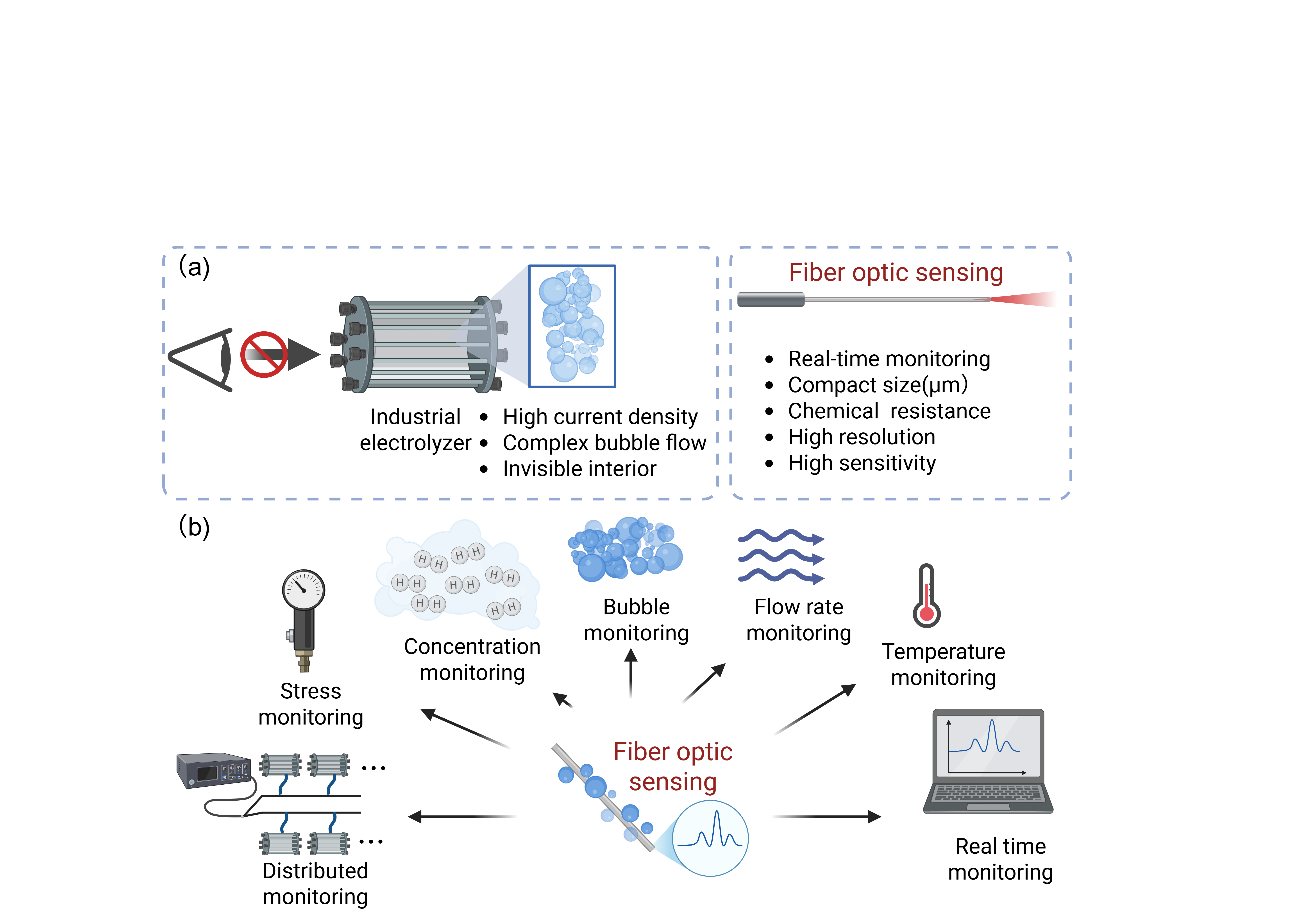 针对这一难题,研究团队首先系统梳理了从电极表面到电解槽内部的多种气泡监测技术。论文指出,电极表面方法虽然能够获得高空间分辨率,但难以兼顾时间分辨率,且图像数据处理繁琐;而利用 X射线或中子成像等方法探测电解槽内部气液两相流,则因成本高昂和操作复杂而难以普及。文章明确提出,发展具备高灵敏度、耐极端环境、可嵌入使用的光纤传感技术,有望打破现有瓶颈,推动气泡研究向工程化应用转变。成果以综述形式发表于《科学通报》。