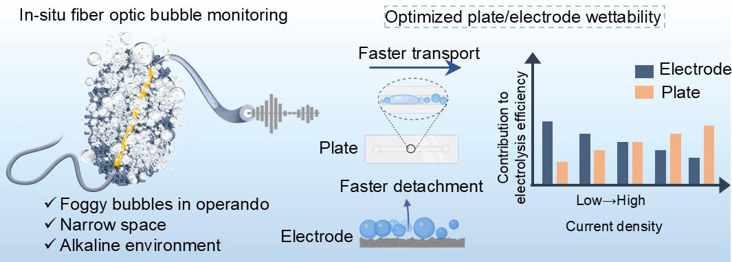 图3基于光纤传感的电解槽气泡动力学监测揭示极板–电极润湿性对效率的差异化贡献