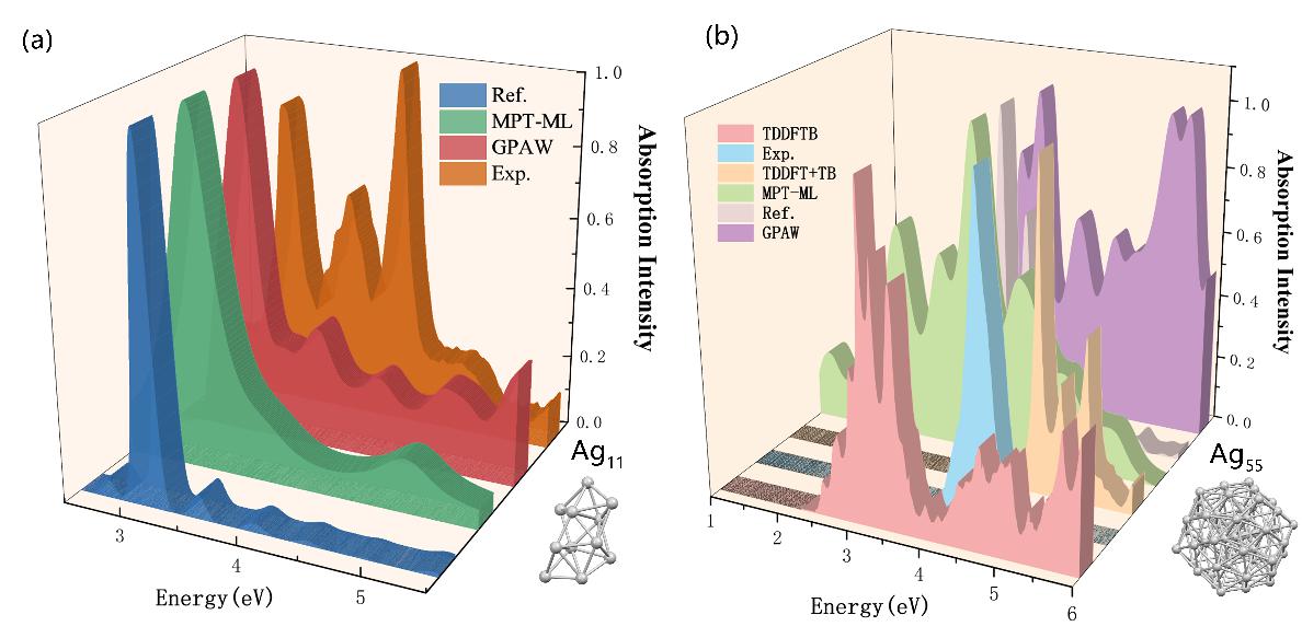 图 3. (a)给出了Ag11四条归一化吸收光谱:参考(快速傅里叶变换)、MPT-ML、GPAW(实时时间依赖密度泛函理论)和实验(固态氩基质,10 K,从 2 至 6 电子伏特扫描)。(b) 对于Ag55的吸收光谱,在 (a) 中基线外添加了 TDDFTB(时间依赖密度泛函理论紧束缚)和 TDDFT+TB。