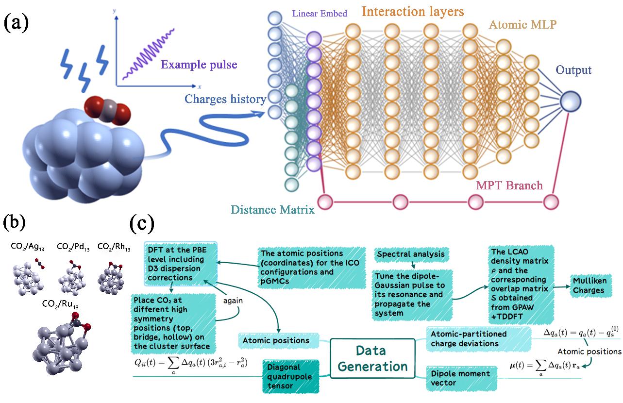 针对这一长期瓶颈,研究团队发展了一种融合矩传播理论(MPT)的层次交互粒子神经网络(HIP-NN),用于原子尺度非平衡电子动力学的快速预测。以典型的 CO₂/M₁₃(M = Ag, Pd, Rh, Ru)吸附–金属簇体系为平台,系统构建了包含实时 Mulliken 电荷、偶极矩、二阶矩、几何结构与距离矩阵在内的多通道数据集,并在此基础上对 HIP-NN 模型进行深度改造,引入 Moment Propagation Theory(MPT) 作为物理先验,实现了对非平衡电子动力学的端到端学习。该模型以13原子CO2/金属团簇(Ag13、Pd13、Rh13、Ru13)为测试体系,通过编码电荷、二阶矩与距离矩阵,将32飞秒的动力学推断时间从rt-TDDFT的数小时压缩至20秒,实现了约540倍加速,主峰能量误差控制在0.3电子伏以内。该工作面向等离激元热载流子调控与光电器件等前沿方向,为理解和设计吸附–金属簇体系中的能量吸收、转换与耗散提供了新工具和新思路。