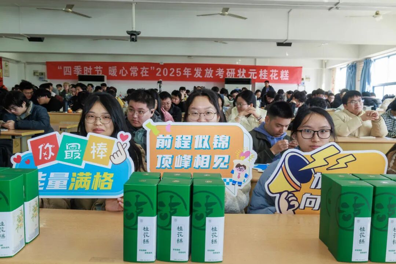 一份份精心准备的“状元桂花糕”,软糯香甜,不仅承载着“蟾宫折桂”的美好祝福,更凝聚着学校与学院师长对学子们的深切关怀与殷切期望。同学们手捧桂花糕,脸上洋溢着温暖与感动,同学们埋头苦读的身影因这份突如其来的暖意而愈发坚定。